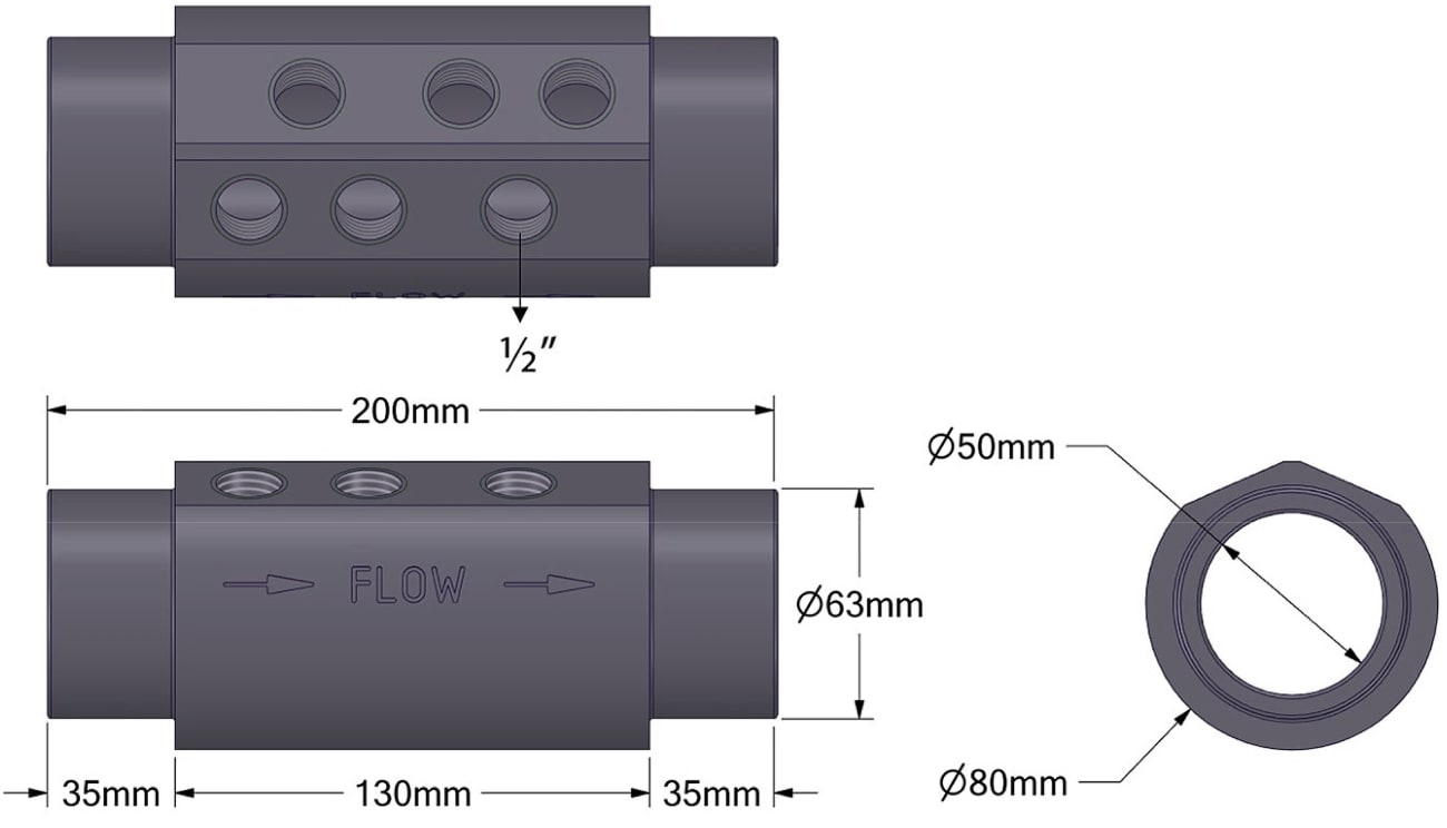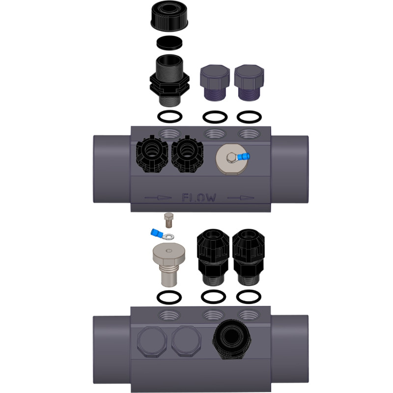Centralisation 6-en-1 : Regroupez vos sondes pH/Redox, votre détecteur de débit, vos injecteurs et la mise à la terre sur un seul composant de 50/63 mm.